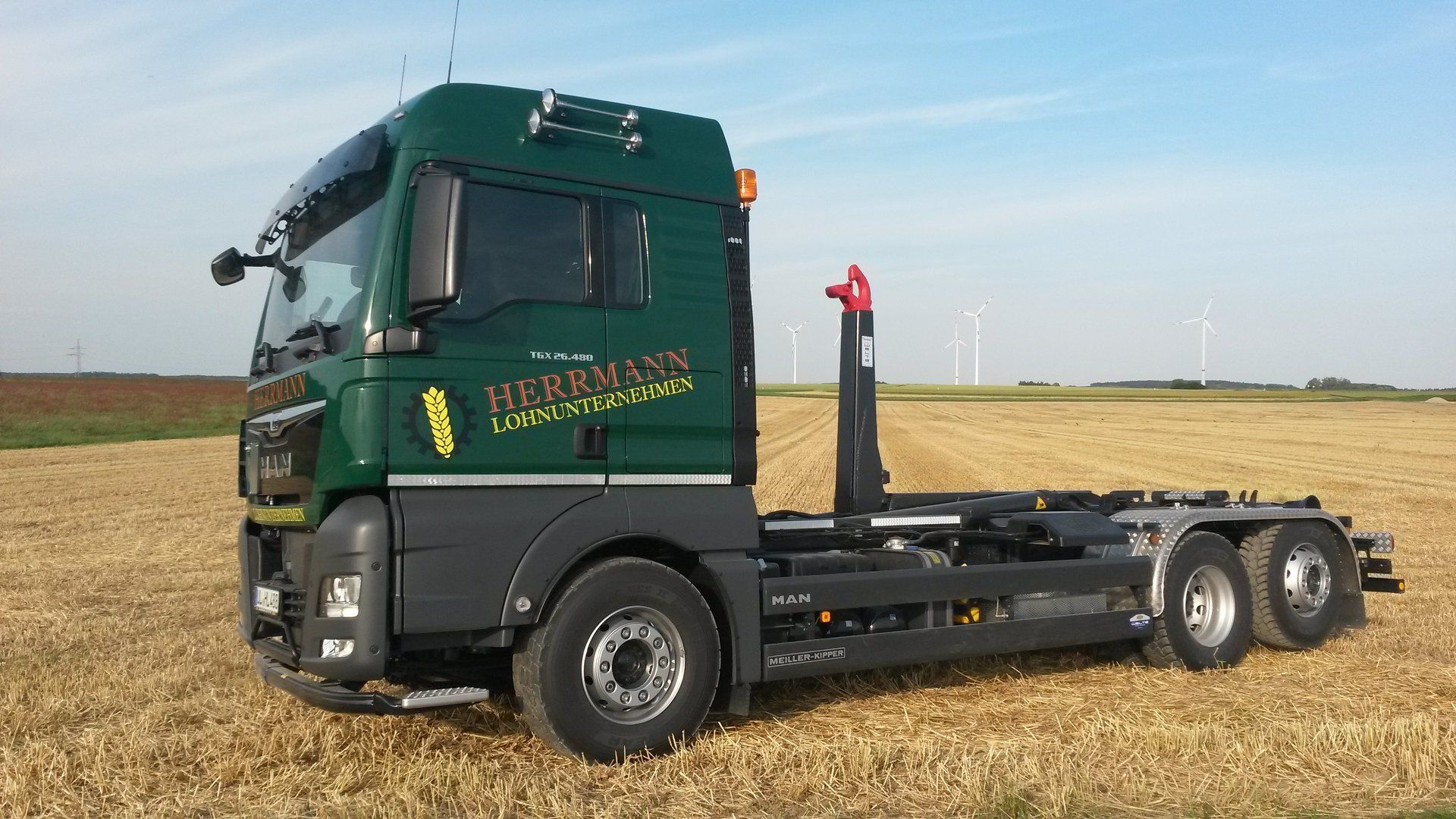 MAN TGX 26.480 mit Meiller Hakenlift-Aufbau mit Hüffermann Containeranhänger